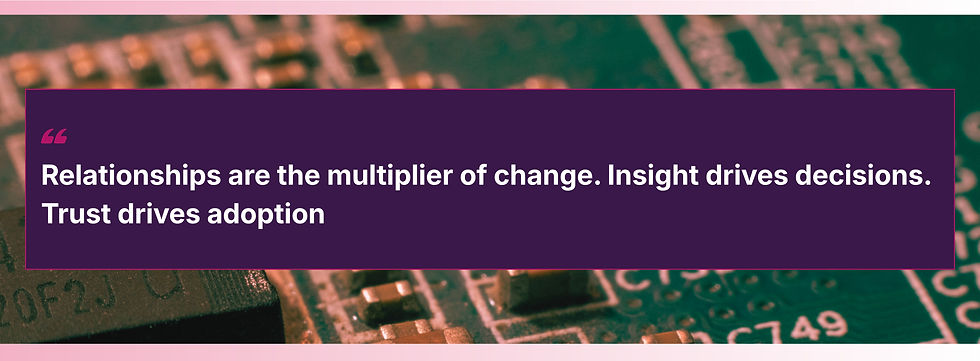 Change is human. Data can highlight patterns. Technology can accelerate processes. But adoption depends on leaders who model behaviour, managers who reinforce change, and teams who feel supported.